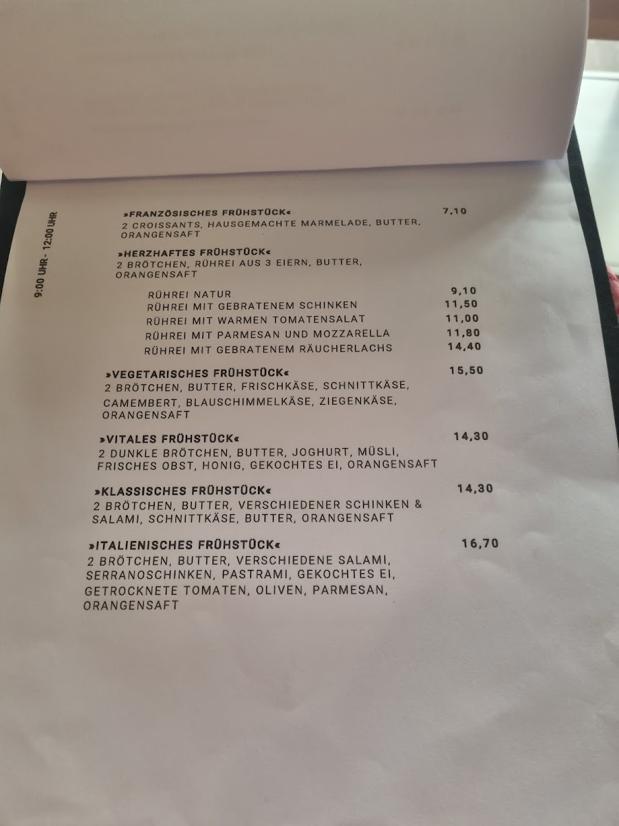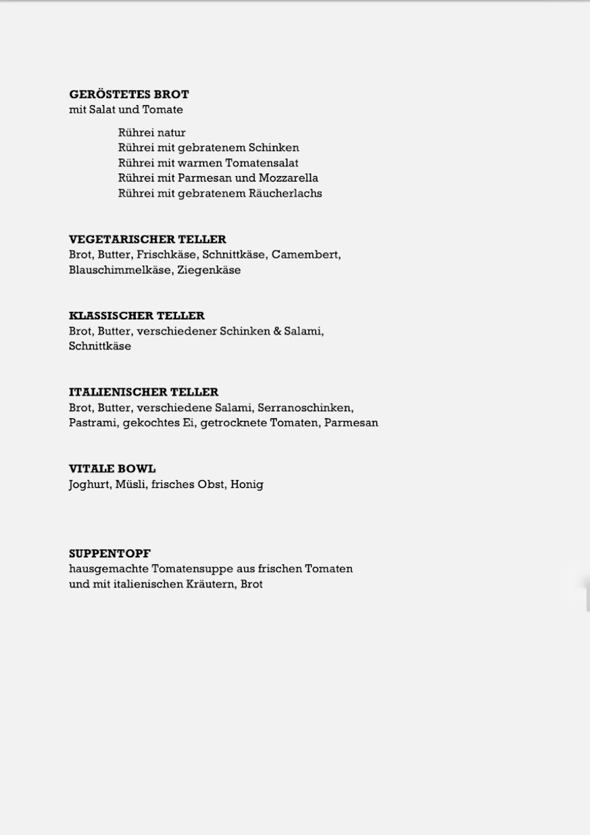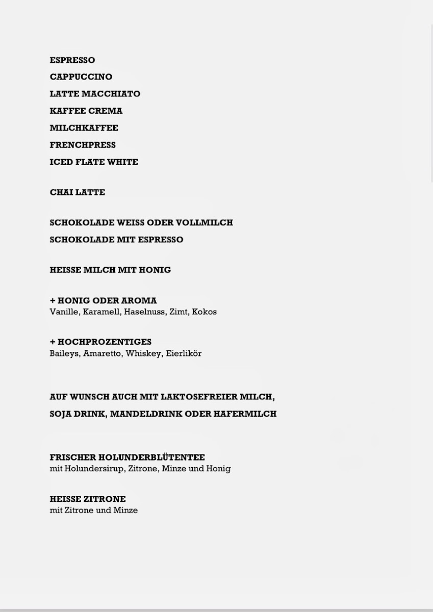On the drinks side, the café’s selection supports both quick coffee breaks and longer sit-down visits: Kleiner Und Großer Cappuccino makes it easy to choose your caffeine level, while Weisse Schokolade adds a sweeter, more dessert-like drink option. Overall, the menu feels cohesive and approachable-built around familiar flavors, a good mix of light and filling dishes, and a strong café-style lineup that makes it easy to find something that matches your mood.